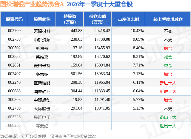 从基金规模来看,国投瑞银产业趋势混合A基金2026年一季度公布的基金规模为13.0亿元,较上一期规模11.92亿元变化了1.08亿元,环比变化了9.06%。该基金最新一期资产配置为:股票占净值比93.93%,无债券类资产,现金占净值比6.15%。从基金持仓来看,该基金当季前十大股票仓位达74.08%,第一大重仓股为天赐材料(002709),持仓占比为10.43%。