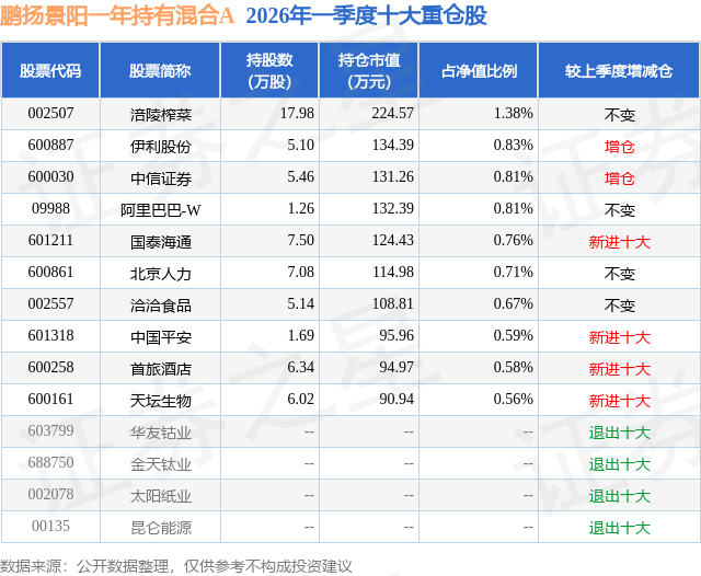 从基金规模来看,鹏扬景阳一年持有混合A基金2026年一季度公布的基金规模为1.54亿元,较上一期规模3.41亿元变化了-1.87亿元,环比变化了-54.96%。该基金最新一期资产配置为:股票占净值比19.23%,债券占净值比98.08%,现金占净值比9.85%。从基金持仓来看,该基金当季前十大股票仓位达7.7%,第一大重仓股为涪陵榨菜(002507),持仓占比为1.38%。
