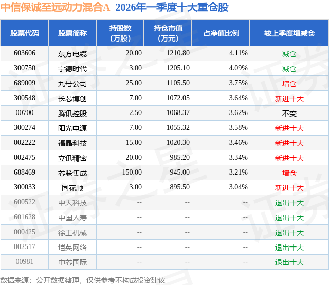 从基金规模来看,中信保诚至远动力混合A基金2026年一季度公布的基金规模为2.08亿元,较上一期规模2.36亿元变化了-2829.96万元,环比变化了-12.0%。该基金最新一期资产配置为:股票占净值比89.28%,无债券类资产,现金占净值比10.83%。从基金持仓来看,该基金当季前十大股票仓位达35.84%,第一大重仓股为东方电缆(603606),持仓占比为4.11%。