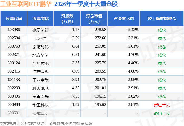 证券之星消息,日前工业互联网ETF鹏华基金公布一季报,2026年一季度最新规模0.51亿元,季度净值涨幅为-0.07%。