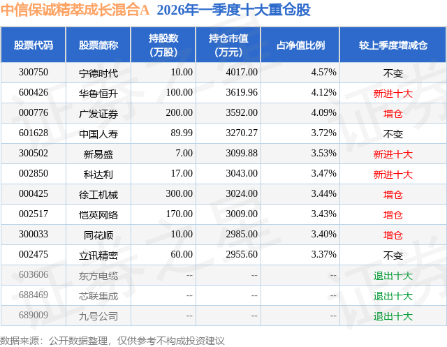 从基金规模来看,中信保诚精萃成长混合A基金2026年一季度公布的基金规模为8.78亿元,较上一期规模10.45亿元变化了-1.67亿元,环比变化了-16.0%。该基金最新一期资产配置为:股票占净值比88.44%,无债券类资产,现金占净值比10.6%。从基金持仓来看,该基金当季前十大股票仓位达37.14%,第一大重仓股为宁德时代(300750),持仓占比为4.57%。