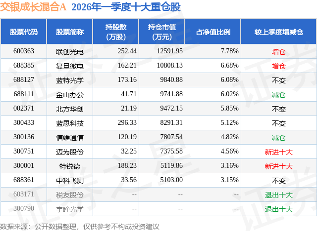 从基金规模来看,交银成长混合A基金2026年一季度公布的基金规模为16.18亿元,较上一期规模16.28亿元变化了-1012.75万元,环比变化了-0.62%。该基金最新一期资产配置为:股票占净值比94.67%,债券占净值比4.03%,现金占净值比1.47%。从基金持仓来看,该基金当季前十大股票仓位达53.22%,第一大重仓股为联创光电(600363),持仓占比为7.78%。