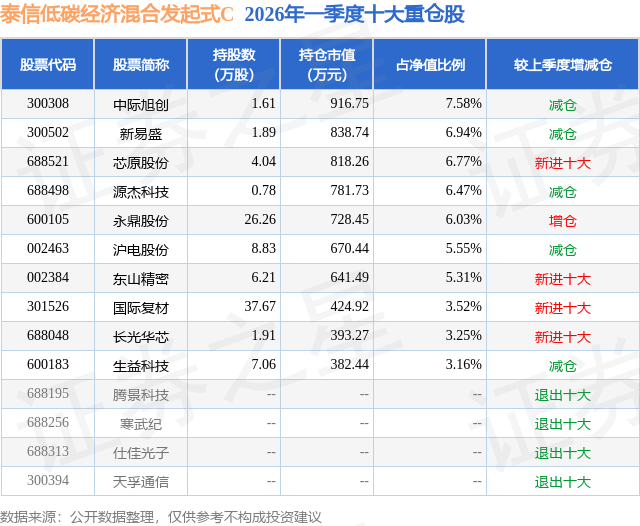 从基金规模来看,泰信低碳经济混合发起式C基金2026年一季度公布的基金规模为1.09亿元,较上一期规模8453.82万元变化了2407.1万元,环比变化了28.47%。该基金最新一期资产配置为:股票占净值比64.98%,无债券类资产,现金占净值比32.29%。从基金持仓来看,该基金当季前十大股票仓位达54.58%,第一大重仓股为中际旭创(300308),持仓占比为7.58%。