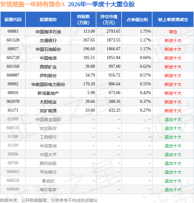 从基金规模来看,安信楚盈一年持有混合A基金2026年一季度公布的基金规模为9.46亿元,较上一期规模1.93亿元变化了7.53亿元,环比变化了389.81%。该基金最新一期资产配置为:股票占净值比12.56%,债券占净值比84.5%,现金占净值比2.89%。从基金持仓来看,该基金当季前十大股票仓位达7.55%,第一大重仓股为中国海洋石油(00883),持仓占比为1.75%。