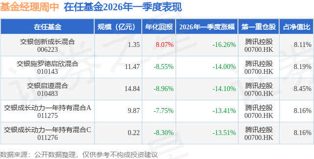 证券之星消息,日前交银成长动力一年持有混合C基金公布一季报,2026年一季度最新规模0.22亿元,季度净值涨幅为-13.51%。