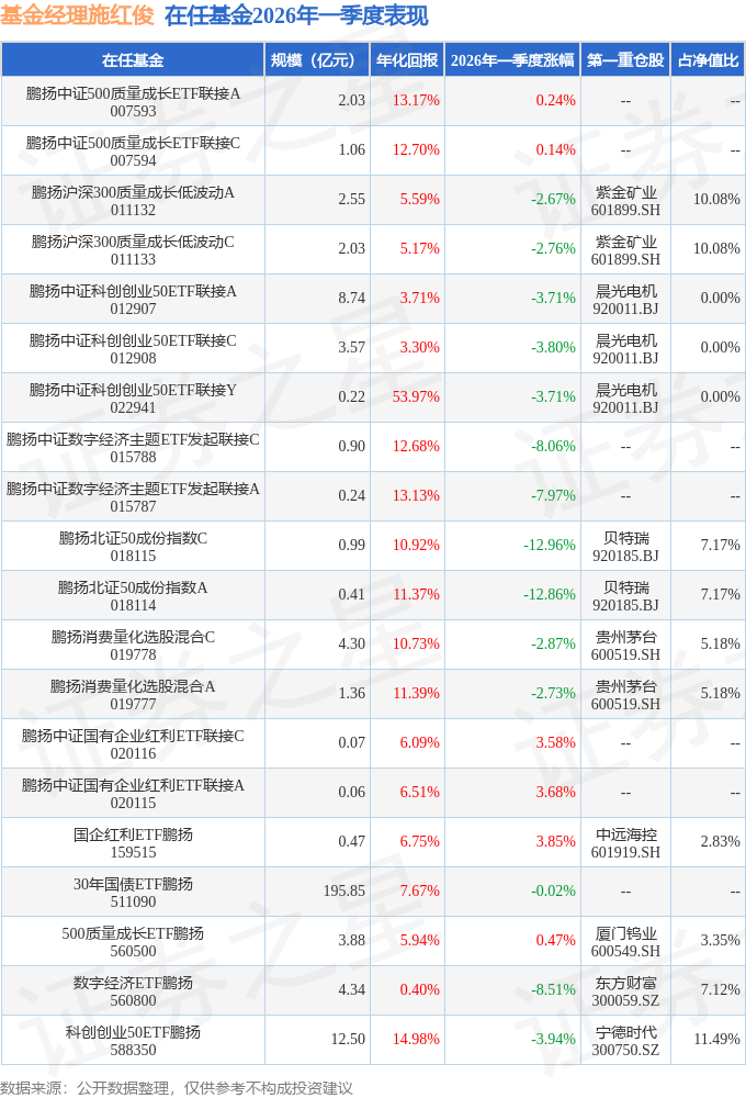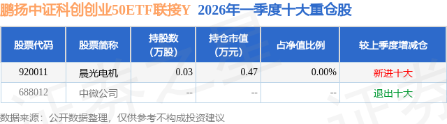 从基金规模来看,鹏扬中证科创创业50ETF联接Y基金2026年一季度公布的基金规模为0.22亿元,较上一期规模10.87万元变化了2239.11万元,环比变化了20604.02%。该基金最新一期资产配置为:无股票类资产,债券占净值比5.73%,现金占净值比0.31%。从基金持仓来看,该基金当季前十大股票仓位达0.0%,第一大重仓股为晨光电机(920011),持仓占比为0.0%。