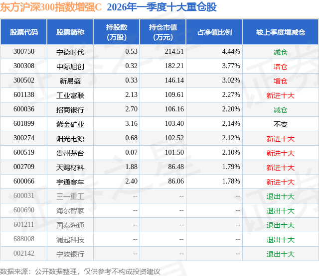 从基金规模来看,东方沪深300指数增强C基金2026年一季度公布的基金规模为0.2亿元,较上一期规模7336.05万元变化了-5289.26万元,环比变化了-72.1%。该基金最新一期资产配置为:股票占净值比93.24%,债券占净值比5.63%,现金占净值比1.61%。从基金持仓来看,该基金当季前十大股票仓位达25.63%,第一大重仓股为宁德时代(300750),持仓占比为4.44%。