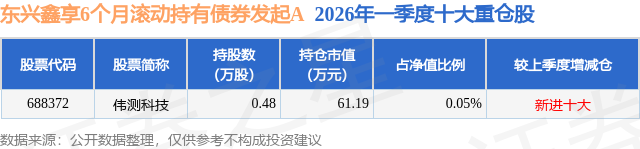 从基金规模来看,东兴鑫享6个月滚动持有债券发起A基金2026年一季度公布的基金规模为8.97亿元,较上一期规模21.76亿元变化了-12.78亿元,环比变化了-58.75%。该基金最新一期资产配置为:股票占净值比0.05%,债券占净值比128.03%,现金占净值比0.23%。从基金持仓来看,该基金当季前十大股票仓位达0.05%,第一大重仓股为伟测科技(688372),持仓占比为0.05%。