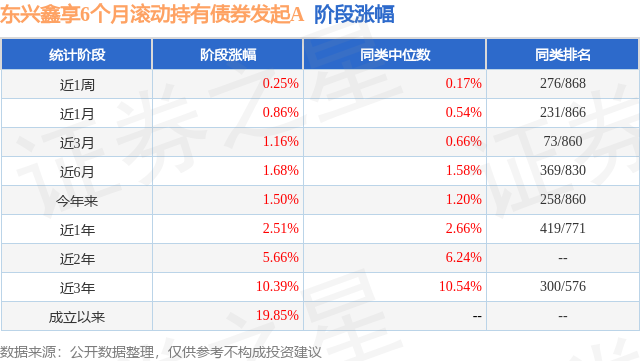 从业绩表现来看,东兴鑫享6个月滚动持有债券发起A基金过去一年净值涨幅为2.51%,在同类基金中排名419/771,同类基金过去一年净值涨幅中位数为2.66%。而基金过去一年的最大回撤为-0.59%,成立以来的最大回撤为-0.7%。