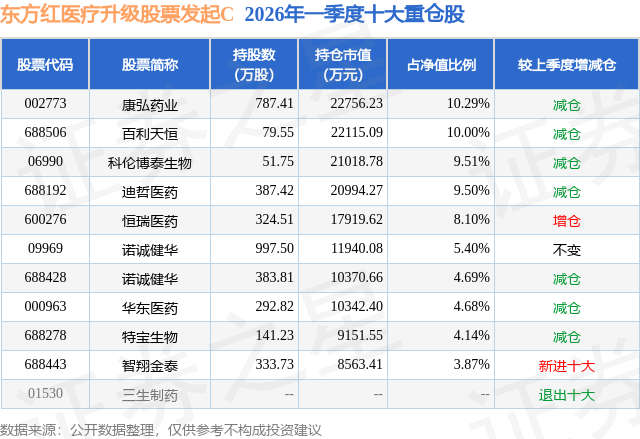 对本季度基金运作,基金经理的观点如下:市场回顾:2026年一季度,中信医药指数下跌0.89%,其中1月上涨,2、3月下跌。从子板块来看,板块比较平均,和去年行情不同,板块中个股短期走势差异较大。比如创新药(生物药、化学制药)、CXO(医药服务外包)、药房、中药、医疗器械中,既有个股涨幅较大也有个股跌幅较大,原因各不相同,有些和主题相关比如脑机接口、AI医疗、小核酸;有些和业绩相关,比如CXO、上游供应商、医疗器械;有些和持仓结构和催化剂有无相关,比如创新药。基金运作:2026年一季度,我在子行业选择上继续坚定不移地选择了创新药方向,作为医药行业中产业趋势最明确的方向就是创新药,因此我继续做了这个选择,同时在主力组合中我依然是用Biotech(生物科技类公司)、传统制药企业转型创新的公司两大类做组合。同时香港持仓20%仓位维持。尾部仓位我做了较多的交易,做一些止盈,同时做一些小幅切换。在重仓股中,有一些个股在一季度的表现差强人意。2026年的展望:今年的开局,全球形势更加复杂和难预测,因此市场波动也比较大,既受到全球加息预期的影响,又有地缘冲突的影响,同时也有国内宏观环境和内需市场的影响。因此在混乱的外部环境和市场走势下,我仔细思考了以下几件事情,形成我今年的策略,和大家分享也供大家参考。1、回顾极端的市场,应该如何操作?——不要在极端的市场做极端的选择。过去的四年,市场经历过几次较大的恐慌或流动性危机带来的短期大幅下跌,2022年4月、2024年2月雪球事件、2024年9月、2025年4月关税危机,如果更远还有2018年9月的贸易摩擦、2016年初的三次熔断,每次引发下跌的因素不同,但每次下跌后的市场都有相似之处,每次下跌之后,都是之后基本面优质的行业和公司会先走出新的趋势。因此在今年混乱的市场之下,一方面我选择保持仓位;另一方面也在持仓上逐步做一些调整,坚守基本面优质的公司,选择一些新的基本面优质的公司布局,希望在未来,可以通过优质的基本面,在市场的混乱期过后,会迎来价值的发现或者提升。2、医药行业今年的走势会如何?创新药还有机会吗?——创新药是医药行业中,技术有一定全球竞争力的子行业,行业发展趋势明确。因此我坚定选择创新药。但是和去年不同,去年创新药子行业整体因为风格的带动,好公司和差公司都有一波上涨,之后有所分化,这是市场的新的学习效应带来的。市场经历了一年的学习,已经有所分辨,因此我预期,今年基本面优质的龙头公司随着创新药临床的进展进一步推进,比如全球临床的推进;产品在中国获批;全球临床和中国三期临床数据读出等等因此,临床后期产品风险进一步下降,确定性进一步提升,龙头公司在确定性提升中,有望进一步有所收获。同时新的技术会带来新的公司的发展,部分新公司或者有新产品的老公司,新的故事会被市场所挖掘。规避老的故事,但缺乏临床进展的公司。3、行业政策的展望:2026年的政府工作报告首次把创新药提为“新兴支柱产业”,从2024年“创新药”首次出现在政府工作报告,2025年创新药全球授权金额创新高1300亿美元,较2024年519亿美元增长超过100%。今年对于创新药行业的定位进一步升级,同时2025年作为商业医保目录首次提出的第一年,今年也看到政府对于商业医保后续的发展有了更多的支持。可以期待国内政策对于创新药的鼓励支持进一步加大,更加实际和落地。创新药行业不仅可以出海,同样可以期待未来十年的内需市场的进一步扩大。总结2026年的医药投资策略:继续基于产业趋势选择创新药为主要方向,同时积极寻找其他子行业中增速较快的新公司,寻找一些潜在的新标的进步布局。在投资方法上,继续产业趋势和价值挖掘同步进行,在组合中也是高估值和低估值同行。可能在2026年的复杂市场上,锐度会有所降低。再次感谢东方红医疗升级的老朋友们,感谢大家的陪伴和支持,也感谢大家的鞭策。过去的一季度不容易,希望未来,我可以以稳定的方法论、更轻松的心态、更灵活的操作手段,争取持续不断为大家带来长期稳定的收益。我会一直和你们在一起持有。谢谢!