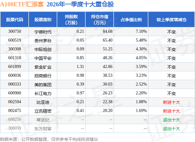 从基金规模来看,A100ETF汇添富基金2026年一季度公布的基金规模为0.12亿元,较上一期规模1233.55万元变化了-41.19万元,环比变化了-3.34%。该基金最新一期资产配置为:股票占净值比96.15%,无债券类资产,现金占净值比3.81%。从基金持仓来看,该基金当季前十大股票仓位达36.04%,第一大重仓股为宁德时代(300750),持仓占比为7.1%。