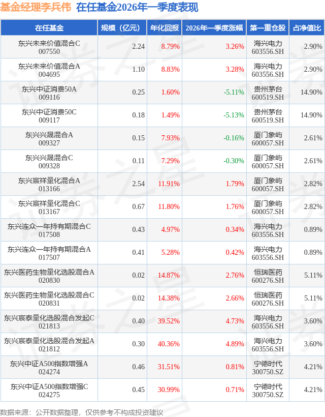 证券之星消息,日前东兴宸祥量化混合A基金公布一季报,2026年一季度最新规模2.54亿元,季度净值涨幅为1.79%。