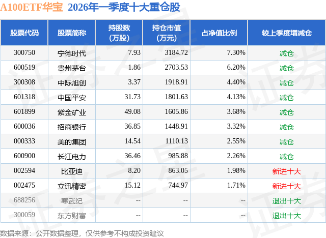 从基金规模来看,A100ETF华宝基金2026年一季度公布的基金规模为4.36亿元,较上一期规模5.56亿元变化了-1.2亿元,环比变化了-21.62%。该基金最新一期资产配置为:股票占净值比99.15%,无债券类资产,现金占净值比0.86%。从基金持仓来看,该基金当季前十大股票仓位达37.53%,第一大重仓股为宁德时代(300750),持仓占比为7.3%。