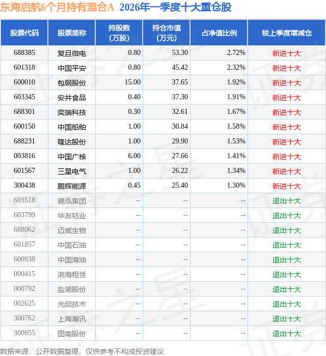 从基金规模来看,东海启航6个月持有混合A基金2026年一季度公布的基金规模为0.14亿元,较上一期规模4813.56万元变化了-3388.61万元,环比变化了-70.4%。该基金最新一期资产配置为:股票占净值比28.18%,债券占净值比49.71%,现金占净值比4.81%。从基金持仓来看,该基金当季前十大股票仓位达17.7%,第一大重仓股为复旦微电(688385),持仓占比为2.72%。