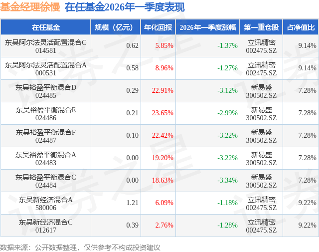 证券之星消息,日前东吴阿尔法灵活配置混合C基金公布一季报,2026年一季度最新规模0.62亿元,季度净值涨幅为-1.37%。