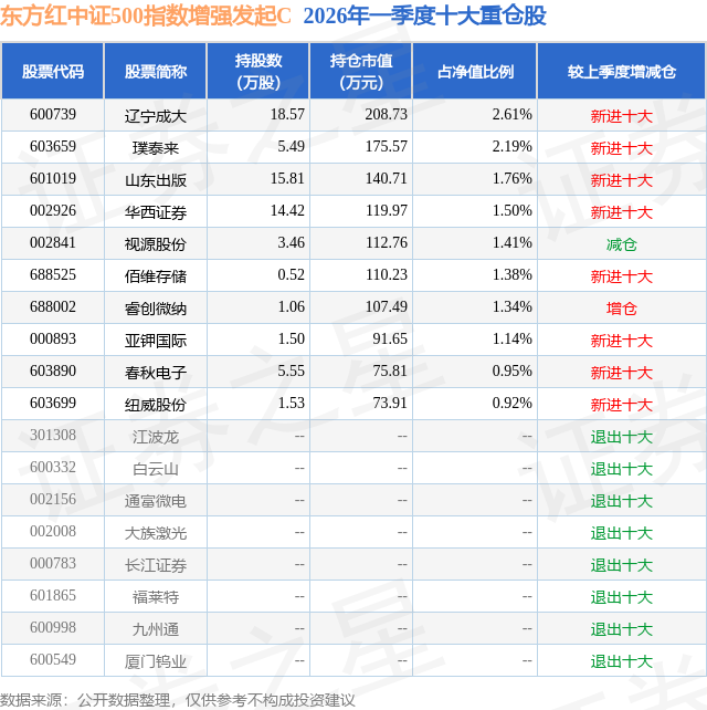 从基金规模来看,东方红中证500指数增强发起C基金2026年一季度公布的基金规模为0.46亿元,较上一期规模3470.23万元变化了1117.4万元,环比变化了32.2%。该基金最新一期资产配置为:股票占净值比87.87%,无债券类资产,现金占净值比11.5%。从基金持仓来看,该基金当季前十大股票仓位达15.2%,第一大重仓股为辽宁成大(600739),持仓占比为2.61%。
