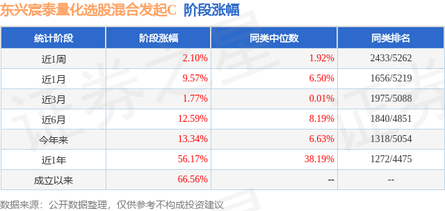 从业绩表现来看,东兴宸泰量化选股混合发起C基金过去一年净值涨幅为56.17%,在同类基金中排名1272/4475,同类基金过去一年净值涨幅中位数为38.19%。而基金过去一年的最大回撤为-13.89%,成立以来的最大回撤为-14.3%。