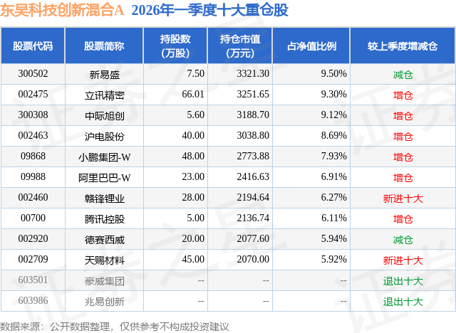 从基金规模来看,东吴科技创新混合A基金2026年一季度公布的基金规模为2.0亿元,较上一期规模3526.61万元变化了1.65亿元,环比变化了468.37%。该基金最新一期资产配置为:股票占净值比92.58%,无债券类资产,现金占净值比9.07%。从基金持仓来看,该基金当季前十大股票仓位达75.69%,第一大重仓股为新易盛(300502),持仓占比为9.5%。