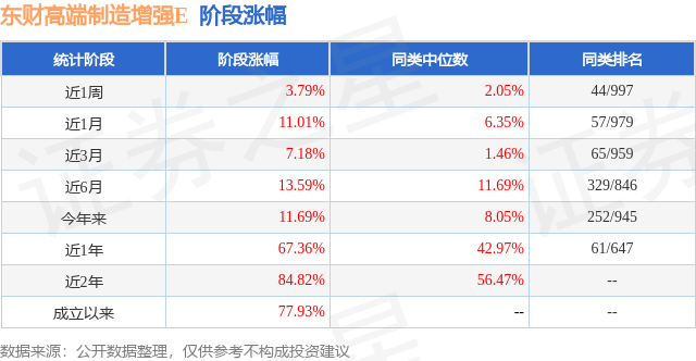从业绩表现来看,东财高端制造增强E基金过去一年净值涨幅为67.36%,在同类基金中排名61/647,同类基金过去一年净值涨幅中位数为42.97%。而基金过去一年的最大回撤为-12.54%,成立以来的最大回撤为-19.6%。