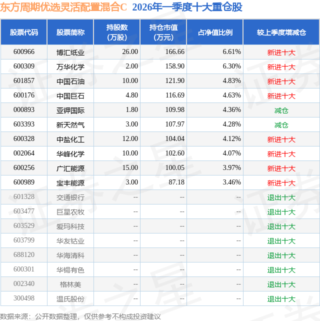从基金规模来看,东方周期优选灵活配置混合C基金2026年一季度公布的基金规模为0.02亿元,较上一期规模1002.49万元变化了-755.59万元,环比变化了-75.37%。该基金最新一期资产配置为:股票占净值比85.99%,债券占净值比6.39%,现金占净值比7.98%。从基金持仓来看,该基金当季前十大股票仓位达46.63%,第一大重仓股为博汇纸业(600966),持仓占比为6.61%。