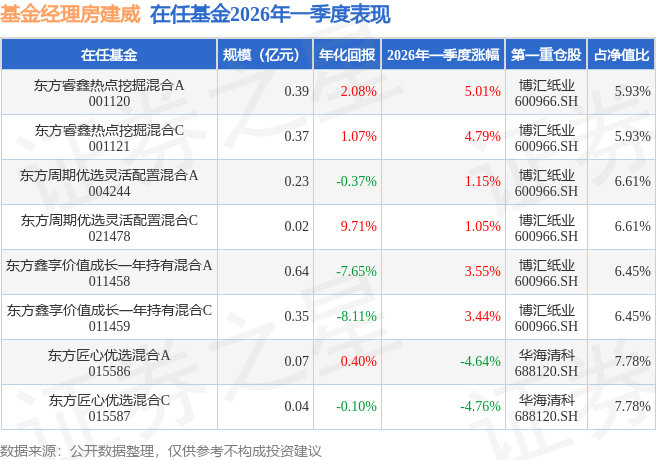 证券之星消息,日前东方周期优选灵活配置混合C基金公布一季报,2026年一季度最新规模0.02亿元,季度净值涨幅为1.05%。
