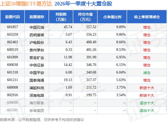 从基金规模来看,上证50增强ETF易方达基金2026年一季度公布的基金规模为0.56亿元,较上一期规模5599.0万元变化了40.28万元,环比变化了0.72%。该基金最新一期资产配置为:股票占净值比90.75%,无债券类资产,现金占净值比8.6%。从基金持仓来看,该基金当季前十大股票仓位达69.0%,第一大重仓股为中国石油(601857),持仓占比为9.89%。