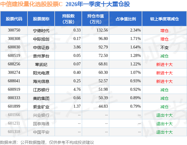 证券之星消息,日前中信建投量化选股股票C基金公布一季报,2026年一季度最新规模0.31亿元,季度净值涨幅为-1.46%。