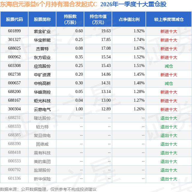 从基金规模来看,东海启元添益6个月持有混合发起式C基金2026年一季度公布的基金规模为0.0亿元。该基金最新一期资产配置为:股票占净值比18.22%,债券占净值比73.92%,现金占净值比2.89%。从基金持仓来看,该基金当季前十大股票仓位达15.02%,第一大重仓股为紫金矿业(601899),持仓占比为1.92%。