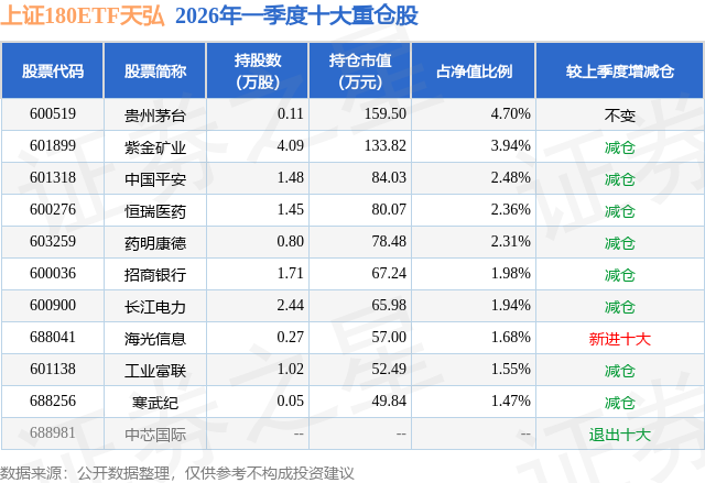 从基金规模来看,上证180ETF天弘基金2026年一季度公布的基金规模为0.34亿元,较上一期规模3788.04万元变化了-395.76万元,环比变化了-10.45%。该基金最新一期资产配置为:股票占净值比99.46%,无债券类资产,现金占净值比0.33%。从基金持仓来看,该基金当季前十大股票仓位达24.41%,第一大重仓股为贵州茅台(600519),持仓占比为4.7%。