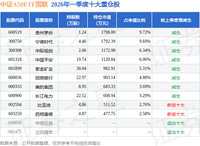 从基金规模来看,中证A50ETF国联基金2026年一季度公布的基金规模为1.85亿元,较上一期规模2.95亿元变化了-1.1亿元,环比变化了-37.33%。该基金最新一期资产配置为:股票占净值比96.71%,无债券类资产,现金占净值比3.46%。从基金持仓来看,该基金当季前十大股票仓位达54.32%,第一大重仓股为贵州茅台(600519),持仓占比为9.72%。