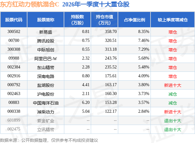 从基金规模来看,东方红动力领航混合C基金2026年一季度公布的基金规模为0.23亿元。该基金最新一期资产配置为:股票占净值比88.29%,无债券类资产,现金占净值比10.68%。从基金持仓来看,该基金当季前十大股票仓位达52.29%,第一大重仓股为新易盛(300502),持仓占比为8.35%。