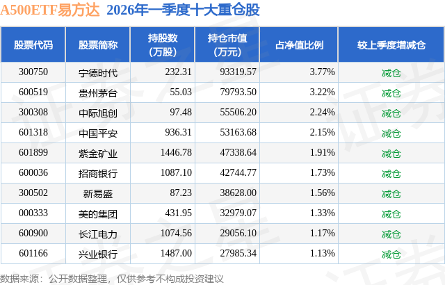 从基金规模来看,A500ETF易方达基金2026年一季度公布的基金规模为247.71亿元,较上一期规模338.63亿元变化了-90.91亿元,环比变化了-26.85%。该基金最新一期资产配置为:股票占净值比99.63%,无债券类资产,现金占净值比0.45%。从基金持仓来看,该基金当季前十大股票仓位达20.21%,第一大重仓股为宁德时代(300750),持仓占比为3.77%。