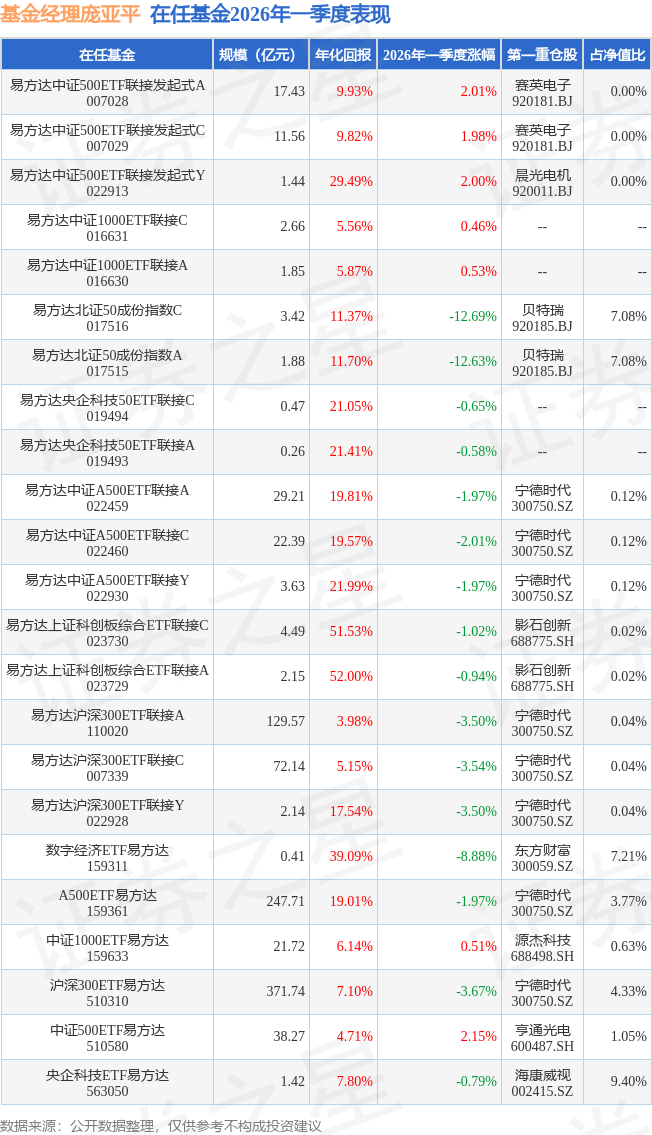 证券之星消息,日前A500ETF易方达基金公布一季报,2026年一季度最新规模247.71亿元,季度净值涨幅为-1.97%。
