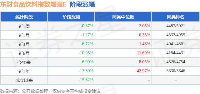 从业绩表现来看,东财食品饮料指数增强E基金过去一年净值涨幅为-13.3%,在同类基金中排名3630/3646,同类基金过去一年净值涨幅中位数为42.97%。而基金过去一年的最大回撤为-17.67%,成立以来的最大回撤为-20.59%。