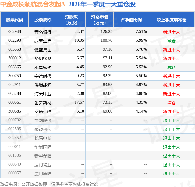 从基金规模来看,中金成长领航混合发起A基金2026年一季度公布的基金规模为0.07亿元,较上一期规模505.38万元变化了214.2万元,环比变化了42.38%。该基金最新一期资产配置为:股票占净值比89.93%,无债券类资产,现金占净值比10.1%。从基金持仓来看,该基金当季前十大股票仓位达54.19%,第一大重仓股为青岛银行(002948),持仓占比为7.51%。