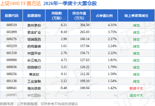从基金规模来看,上证180ETF易方达基金2026年一季度公布的基金规模为0.71亿元,较上一期规模8315.87万元变化了-1250.41万元,环比变化了-15.04%。该基金最新一期资产配置为:股票占净值比96.35%,无债券类资产,现金占净值比3.17%。从基金持仓来看,该基金当季前十大股票仓位达22.94%,第一大重仓股为贵州茅台(600519),持仓占比为4.31%。