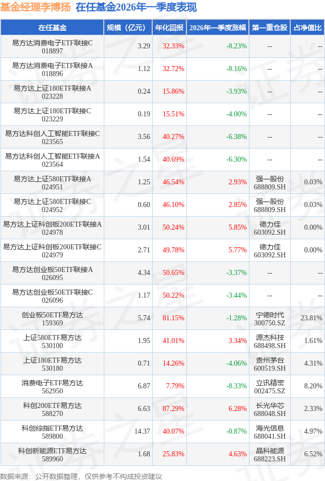 证券之星消息,日前上证180ETF易方达基金公布一季报,2026年一季度最新规模0.71亿元,季度净值涨幅为-4.06%。