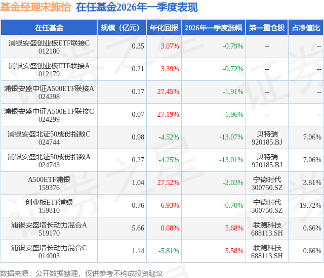 证券之星消息,日前A500ETF浦银基金公布一季报,2026年一季度最新规模1.04亿元,季度净值涨幅为-2.03%。