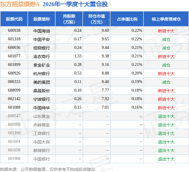 从基金规模来看,东方招益债券A基金2026年一季度公布的基金规模为0.19亿元。该基金最新一期资产配置为:股票占净值比5.83%,债券占净值比92.16%,现金占净值比4.01%。从基金持仓来看,该基金当季前十大股票仓位达1.98%,第一大重仓股为中国海油(600938),持仓占比为0.22%。