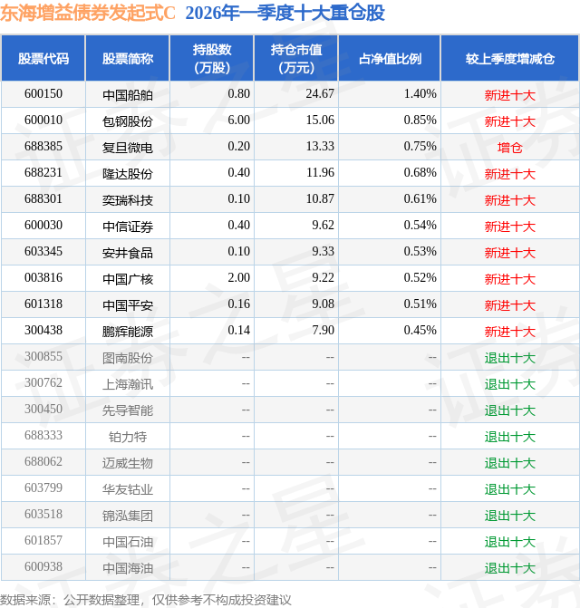 从基金规模来看,东海增益债券发起式C基金2026年一季度公布的基金规模为0.0亿元。该基金最新一期资产配置为:股票占净值比10.47%,债券占净值比83.31%,现金占净值比5.11%。从基金持仓来看,该基金当季前十大股票仓位达6.84%,第一大重仓股为中国船舶(600150),持仓占比为1.4%。