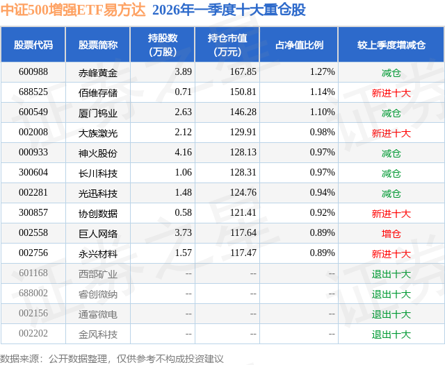 从基金规模来看,中证500增强ETF易方达基金2026年一季度公布的基金规模为1.33亿元,较上一期规模1.29亿元变化了387.92万元,环比变化了3.01%。该基金最新一期资产配置为:股票占净值比95.76%,无债券类资产,现金占净值比3.86%。从基金持仓来看,该基金当季前十大股票仓位达10.07%,第一大重仓股为赤峰黄金(600988),持仓占比为1.27%。