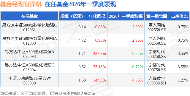 证券之星消息,日前中证500增强ETF易方达基金公布一季报,2026年一季度最新规模1.33亿元,季度净值涨幅为4.66%。