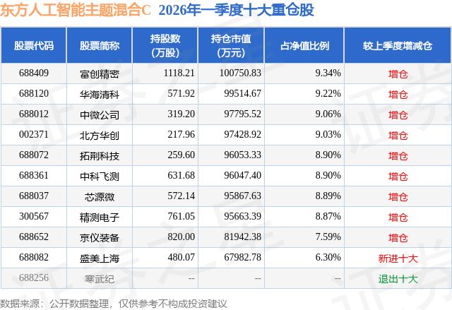 从基金规模来看,东方人工智能主题混合C基金2026年一季度公布的基金规模为97.6亿元,较上一期规模40.77亿元变化了56.83亿元,环比变化了139.4%。该基金最新一期资产配置为:股票占净值比94.76%,债券占净值比5.97%,现金占净值比1.21%。从基金持仓来看,该基金当季前十大股票仓位达86.1%,第一大重仓股为富创精密(688409),持仓占比为9.34%。