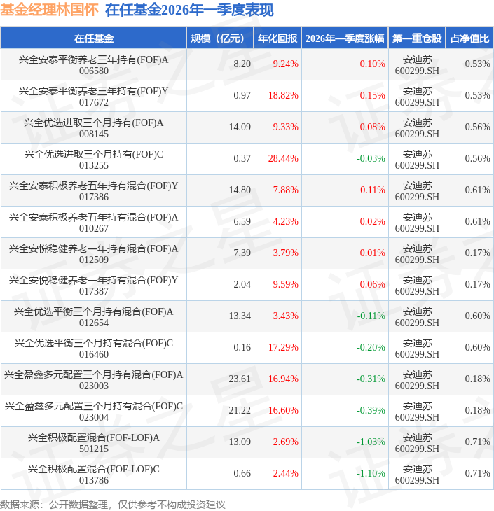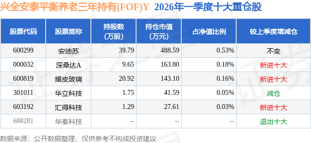 从基金规模来看,兴全安泰平衡养老三年持有(FOF)Y基金2026年一季度公布的基金规模为0.97亿元,较上一期规模5067.14万元变化了4660.32万元,环比变化了91.97%。该基金最新一期资产配置为:股票占净值比0.94%,债券占净值比5.29%,现金占净值比1.7%。从基金持仓来看,该基金当季前十大股票仓位达0.95%,第一大重仓股为安迪苏(600299),持仓占比为0.53%。