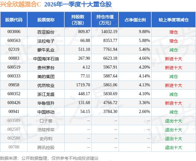从基金规模来看,兴全欣越混合C基金2026年一季度公布的基金规模为4.15亿元,较上一期规模3.74亿元变化了4032.78万元,环比变化了10.78%。该基金最新一期资产配置为:股票占净值比70.35%,债券占净值比4.15%,现金占净值比25.77%。从基金持仓来看,该基金当季前十大股票仓位达48.47%,第一大重仓股为百亚股份(003006),持仓占比为9.88%。