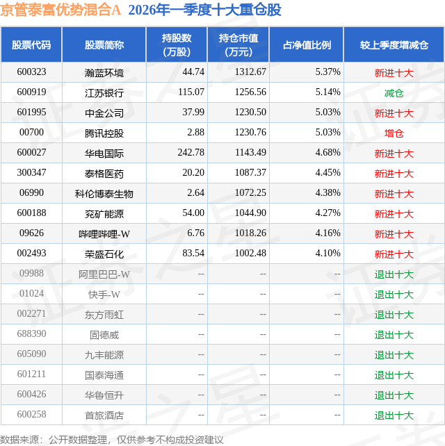从基金规模来看,京管泰富优势混合A基金2026年一季度公布的基金规模为2.42亿元,较上一期规模2.07亿元变化了3419.05万元,环比变化了16.48%。该基金最新一期资产配置为:股票占净值比80.2%,无债券类资产,现金占净值比19.66%。从基金持仓来看,该基金当季前十大股票仓位达46.61%,第一大重仓股为瀚蓝环境(600323),持仓占比为5.37%。