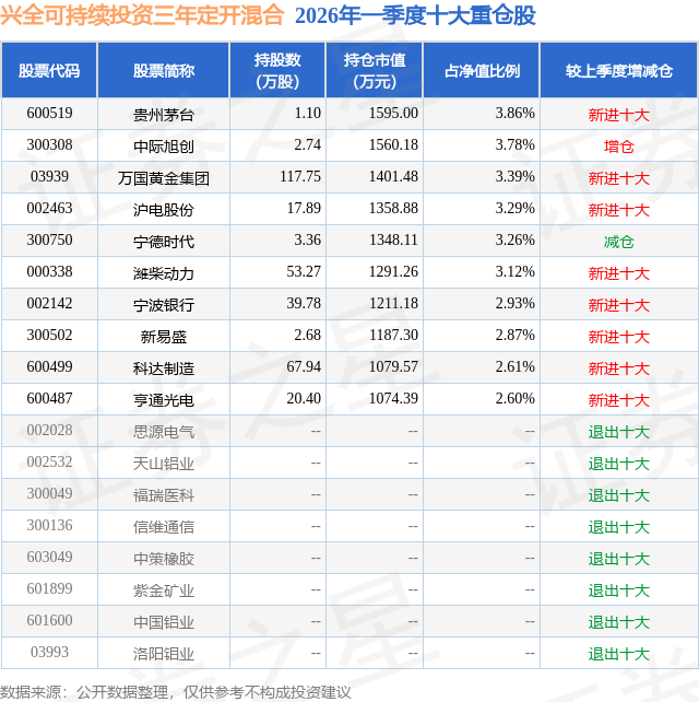 从基金规模来看,兴全可持续投资三年定开混合基金2026年一季度公布的基金规模为4.13亿元,较上一期规模3.91亿元变化了2273.83万元,环比变化了5.82%。该基金最新一期资产配置为:股票占净值比84.36%,债券占净值比0.08%,现金占净值比14.32%。从基金持仓来看,该基金当季前十大股票仓位达31.71%,第一大重仓股为贵州茅台(600519),持仓占比为3.86%。