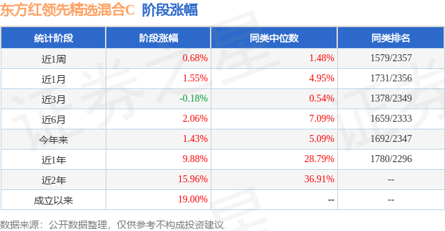 从业绩表现来看,东方红领先精选混合C基金过去一年净值涨幅为9.88%,在同类基金中排名1780/2296,同类基金过去一年净值涨幅中位数为28.79%。而基金过去一年的最大回撤为-2.86%,成立以来的最大回撤为-5.33%。