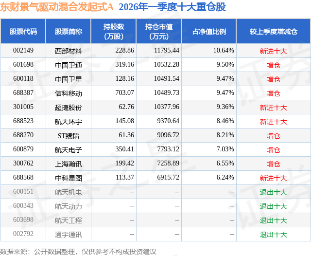 从基金规模来看,东财景气驱动混合发起式A基金2026年一季度公布的基金规模为0.58亿元,较上一期规模1134.67万元变化了4669.27万元,环比变化了411.51%。该基金最新一期资产配置为:股票占净值比94.0%,无债券类资产,现金占净值比5.87%。从基金持仓来看,该基金当季前十大股票仓位达84.93%,第一大重仓股为西部材料(002149),持仓占比为10.64%。