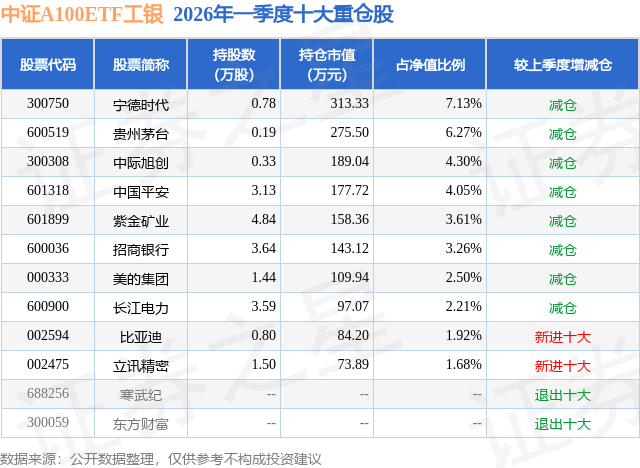 从基金规模来看,中证A100ETF工银基金2026年一季度公布的基金规模为0.44亿元,较上一期规模4842.19万元变化了-449.68万元,环比变化了-9.29%。该基金最新一期资产配置为:股票占净值比96.55%,无债券类资产,现金占净值比3.11%。从基金持仓来看,该基金当季前十大股票仓位达36.93%,第一大重仓股为宁德时代(300750),持仓占比为7.13%。